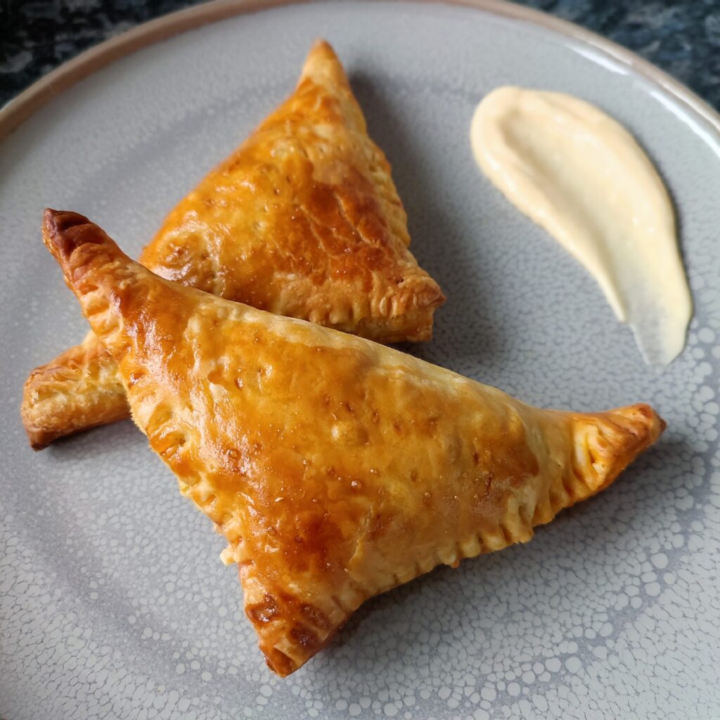 - Spoon one and a half tablespoons of keema and one tablespoon of cheese onto the center of each pastry square. Fold the top corner diagonally to meet the bottom corner, forming a triangle. Gently press along the edges with your fingers to secure the fold, ensuring the filling stays inside without spilling out. To create a firm seal, use the back of a clean fork to crimp the edges. This helps prevent any filling from leaking out during baking. Lightly dock the top of each pastry with a fork—this allows steam to escape and prevents excessive puffing while baking.