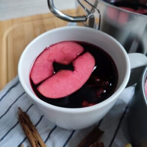 Once cooled, strain out the spices, orange and apple and store in an airtight bottle or jar in the fridge. It will last up to 5 days. When you’re ready to consume it, heat it up in a pot over low heat until it’s hot but not boiling. It’s crucial to ensure the Glühwein doesn’t reach boiling point to prevent the alcohol from evaporating.