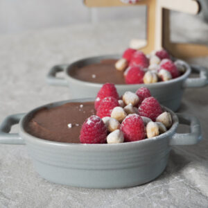 - When ready to serve, remove the mousse from the fridge, top it with fresh raspberries and roasted hazelnuts, and dust with powdered sugar right before serving. Enjoy!