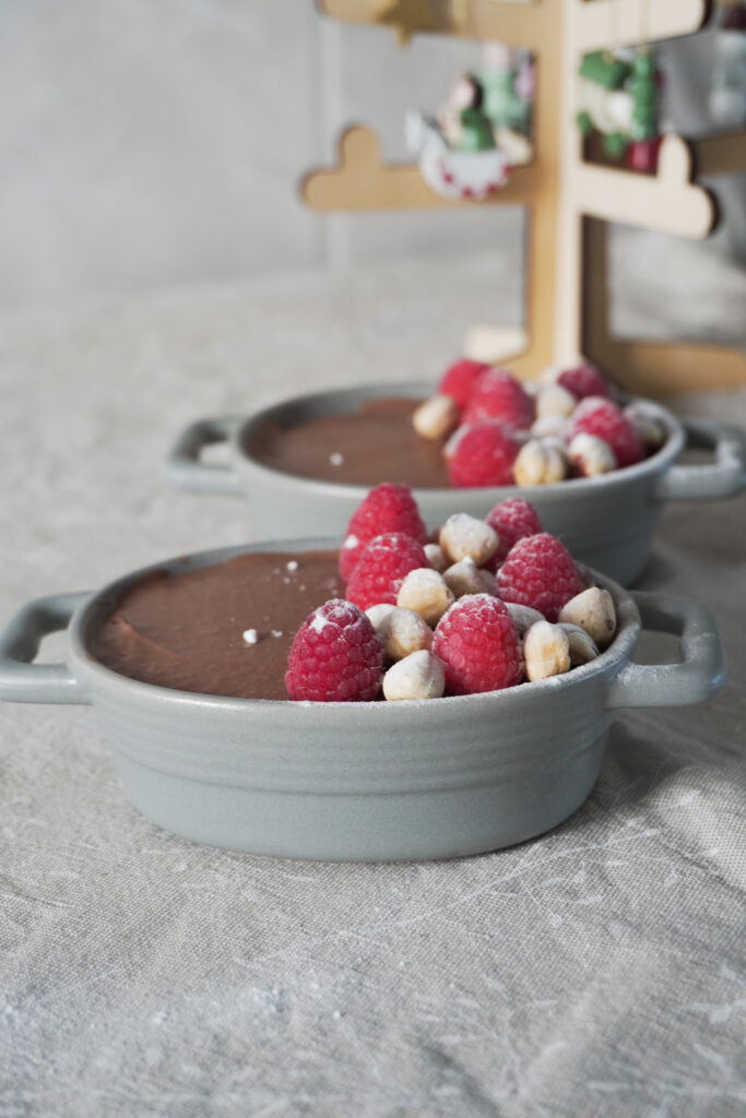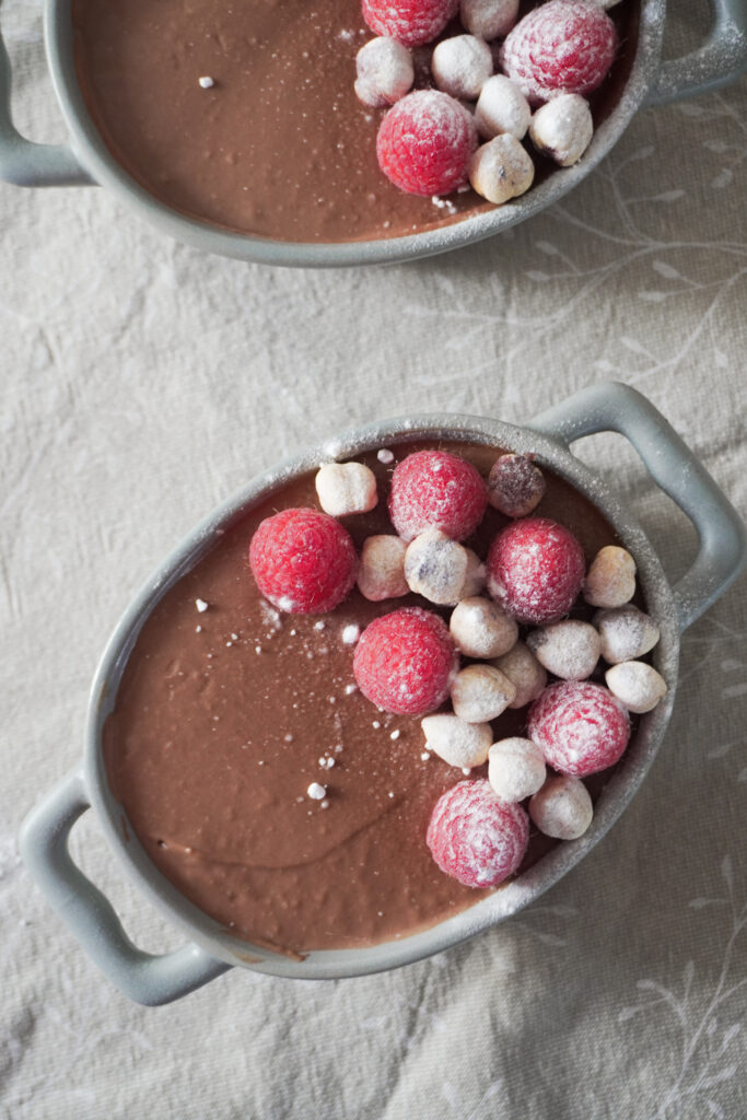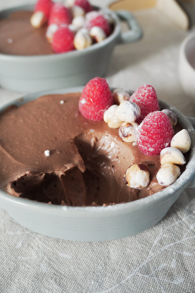 - When ready to serve, remove the mousse from the fridge, top it with fresh raspberries and roasted hazelnuts, and dust with powdered sugar right before serving. Enjoy!