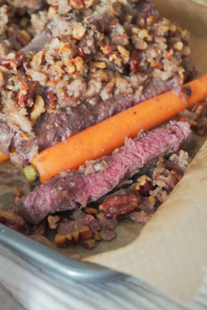 - Remove from the oven, slice the steak, and serve immediately with the roasted carrots. Enjoy!